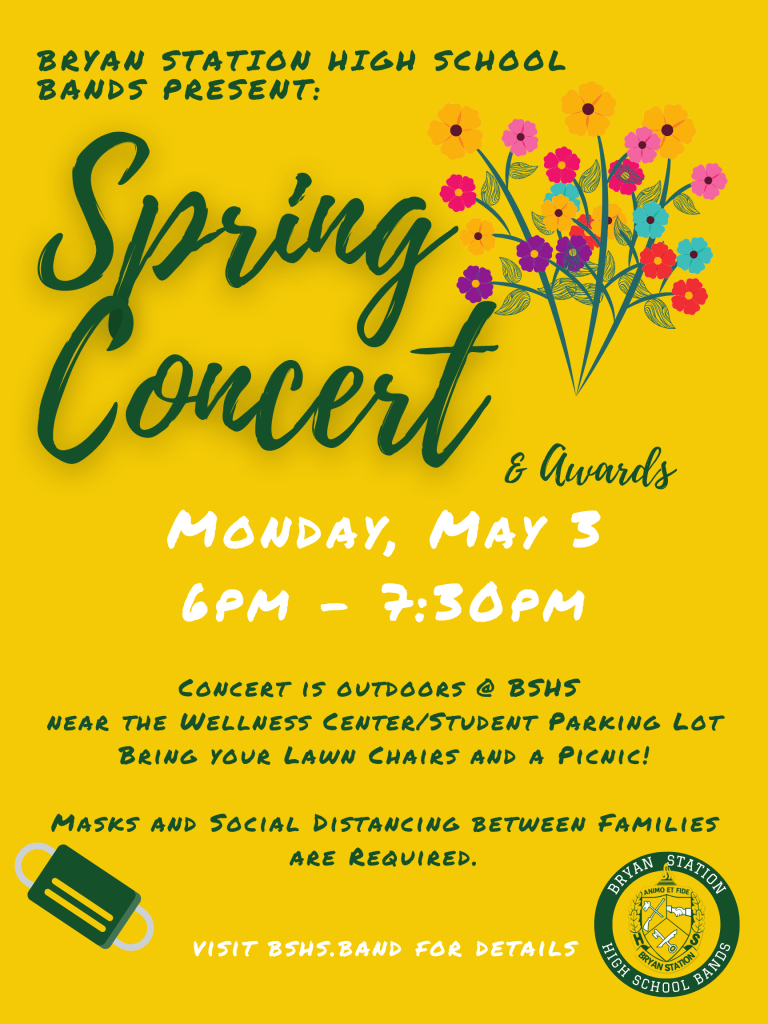 On Monday, May 3, the Bryan Station High School Bands will present their spring concert at 6pm. The OUTDOOR concert will be held adjacent to the Wellness Center, near the student parking lot. Families are encouraged to bring a lawn chair, as no seating will be provided. Masks and social distancing between families are also required.