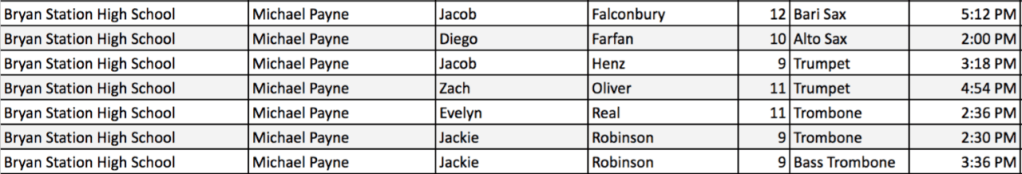 | Jackie | Robinson | Tuba | 6:57 PM | Bryan Station |