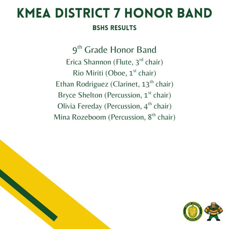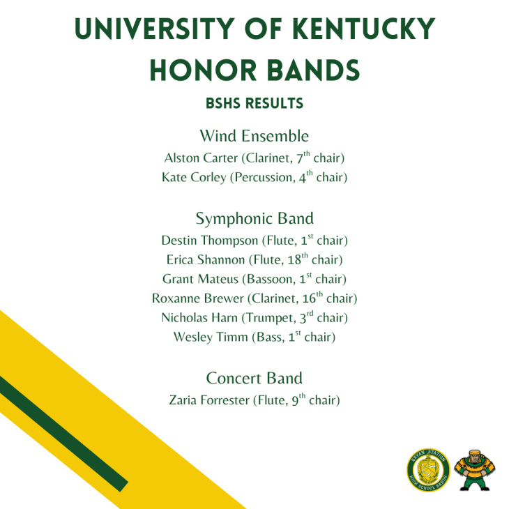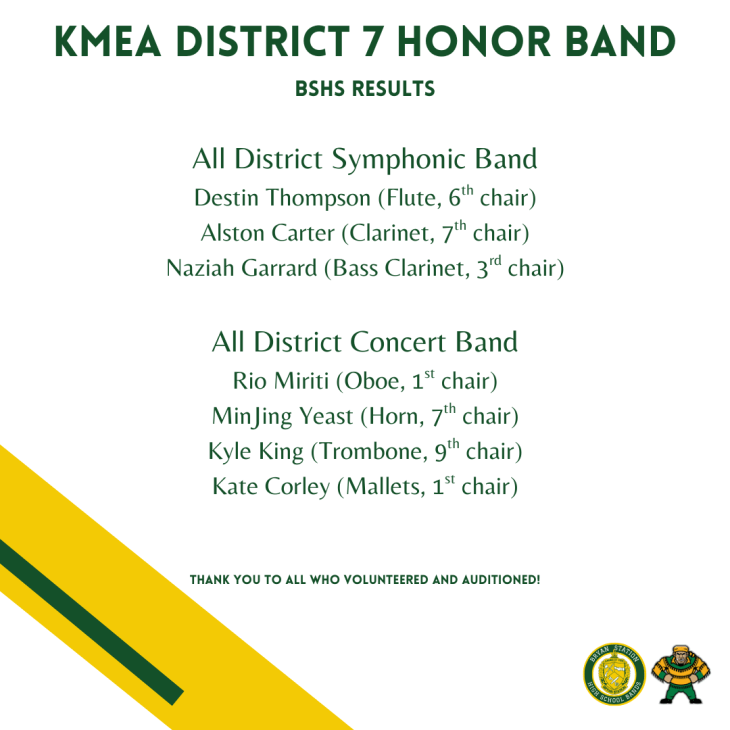 Several BSHS Symphonic Band students auditioned for and were selected to positions in honor bands with KMEA District 7 and the University of Kentucky. Congratulations!