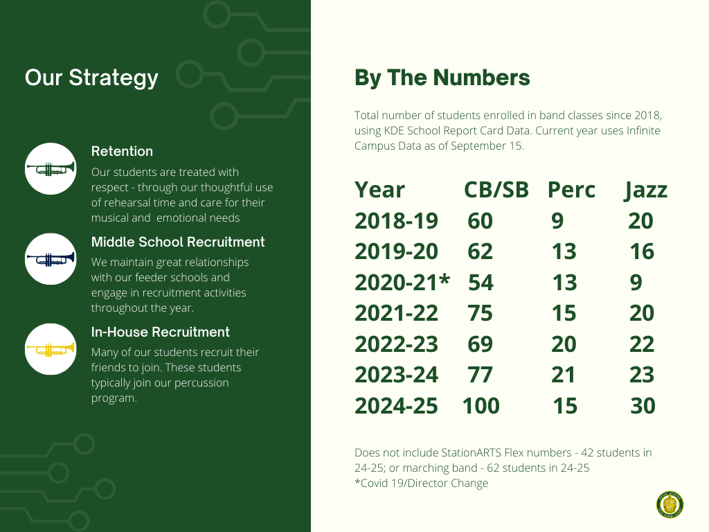 A: We want all students who wish to play an instrument at Bryan Station to be in our program. Our mission is student and family centered – we simply choose to do things a little differently. Please consider upgrading your student’s instrument to a more advanced model or enrolling your student in private lessons with money saved on band fees. This will advance your student further and make our overall program better!
